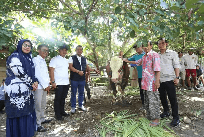 LUWU SAORAKYAT – Bupati Luwu H Patahudding bersama Wakil Bupati Luwu Muh Dhevy Bijak, menyerahkan bantuan hewan kurban dari Presiden RI Prabowo Subianto untuk warga Desa Tabbaja, Kecamatan Kamanre, Kabupaten Luwu Kamis(5/6/2025).