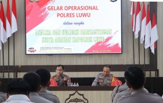 LUWU, SAORAKYAT–Kapolres Luwu AKBP Adnan Pandibu, SH, SIK memimpin rapat Gelar Operasional (GO) di Aula Tebbakke Tongngenge Polres Luwu, Senin (14/7/2025).